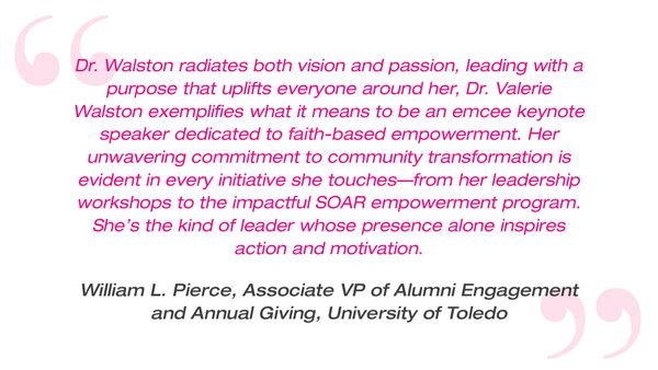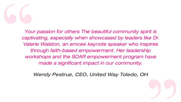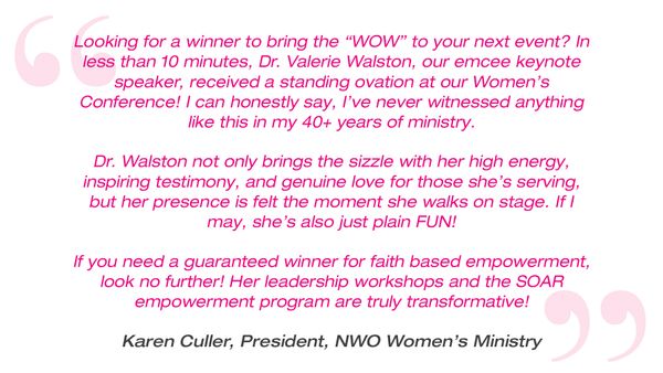 Whether experienced through her book, leadership workshops, speaking engagements as an emcee keynote speaker, or the soon-to-launch SOAR card game and app, Dr. Valerie Walston’s SOAR brand continues to uplift, inspire, and guide people of all walks of life to live with purpose, power, and perseverance.